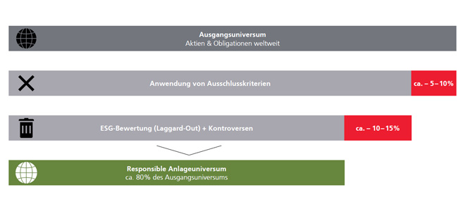 Zur Bestimmung des Responsible-Anlageuniversums durchlaufen Unternehmen einen zweistufigen Filterprozess, durch den ungefähr 20 Prozent des Ausgangsuniversums wegfallen.